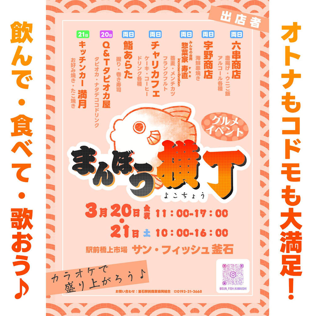 サン・フィッシュ釜石からお知らせ 📣イベント開催情報📣 🔊3月の3連休もイベント開催しまーす📢 ![]() 📆3月20日(金・祝)・21日(土)🗓 グルメイベント まんぼう横丁 を開催いたします🎉 今回出店の事業者の方々をご紹介✨ 六串商店 @mukushisyouten 様 宇野商店 @unoshouten 様 みんなの台所 惣菜家 寿直 @increasevibrationsunao 様 チャリカフェ @charicafe 様 Q&T タピオカ屋 @qandt1002 様 20日(金)のみ キッチンカー 満月 様 21日(土)のみ ランチメニュー🍴 ビールのお供🍺 コーヒー&スイーツまで😋 オトナもコドモも楽しめること間違いなし👉 3連休はぜひぜひサン・フィッシュ釜石へお越しくださ~い🏃 【公式Instagramで随時情報更新します🙌】 ☆一緒に仕事しませんか?☆ ☆1階テナント出店随時募集中!!☆ サン・フィッシュ釜石ではテナントを募集しております。 短期出店でもOKです。 詳細につきましては下記管理事務所までお問い合わせ下さい! お問い合わせは・・・・・0193(31)3668 サン・フィッシュ釜石(釜石駅前商業協同組合)管理事務所まで ☆1階西側・みんなのキッチン☆ ![]() 釣った魚の下処理・お料理教室・各種イベントにご利用下さい。 使用料金は 1時間 1,000円 です。 利用には事前予約が必要です。 下記、管理事務所までご連絡お願い致します。 以下、6月12日に行われました”みんなで釣った魚を調理しよう!”でご利用頂いたスナップです。